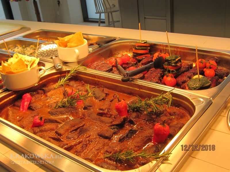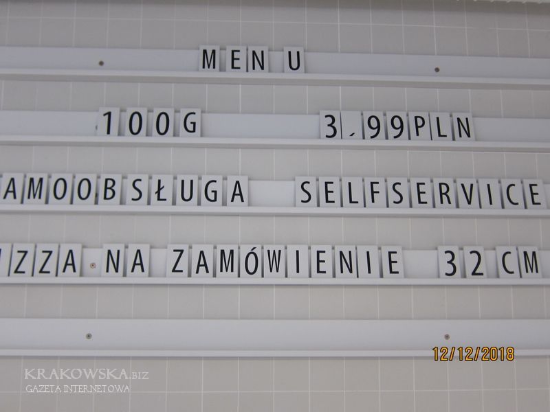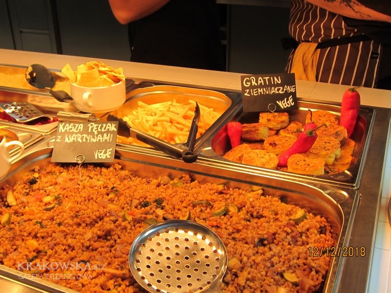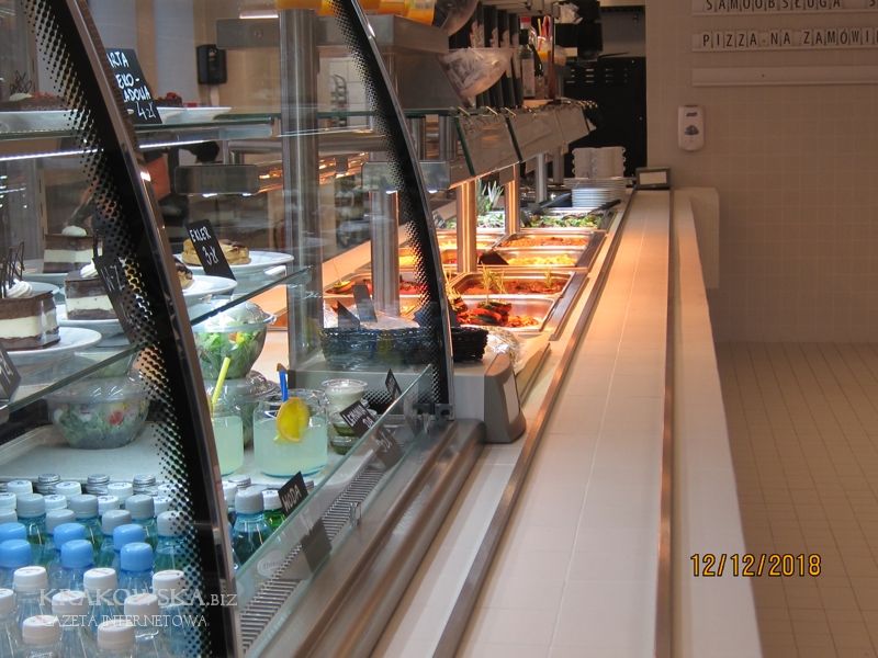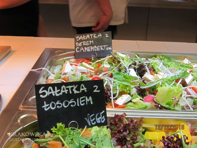 Prezentowane poniżej zdjęcia robiłem chwilę przed godziną rozpoczynającą porę obiadową, czyli kilkanaście minut po godzinie jedenastej. Zatrudnione w trzech biurowcach osoby mają do dyspozycji dwa lokale tej samej firmy. W pierwszym biurowcu od strony ul. 29 listopada można zjeść obiady naszej tradycyjnej kuchni natomiast w „Opolskiej” potrawy z okolic Morza Śródziemnego. Każdy sam sobie układa porcję na talerzu, według indywidualnych potrzeb. Można mieć na talerzu pięć, sześć a nawet więcej potraw, wszystko w tej samej cenie: 3,99 zł za 10 dkg