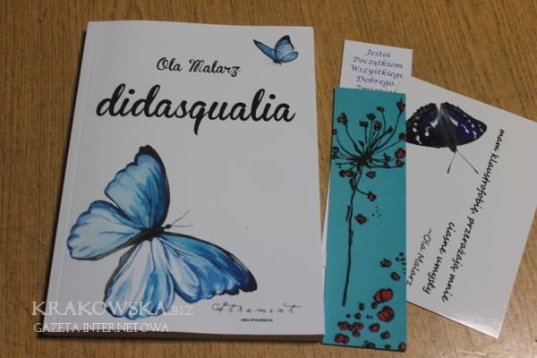 Przybyli na spotkanie goście byli świadkami niezwykle inspirującej i ciekawej rozmowy pomiędzy wyjątkową artystką Olą Malarz a Sylwią Bornos, przyjaciółką autorki. Poetka odpowiadała na zadawane przez Sylwię pytania, opowiedziała o swojej sandomierskiej wystawie „te(k)stuję słowa” oraz o swojej najnowszej książce „didasqualia”, wydanej nakładem Wydawnictwa Nowvatoria, zawartych w niej krótkich tekstach poetyckich, „których podczas tworzenia nigdy nie poprawia i uważa za skończone. Tomik zawiera zbiór form poetyckich, mocno zbliżonych do stylu Leca oraz tradycji haiku, przedstawia miniatury o życiu, miłości i wszechświecie”. Ola mówiła o swoich zamiłowaniach do związków frazeologicznych, zainteresowaniach fizyką kwantową, psychologią i medycyną. Autorka przedstawiła zgromadzonym słuchaczom skąd czerpie inspiracje oraz jaki wpływ na jej artystyczne działania mają muzyka, podróże, fotografia czy spotkania i rozmowy z ludźmi. Uważa, że „Nie mówimy tego, co czujemy. Nie czujemy tego, co mówimy”. Opowiedziała, skąd na stronie tytułowej książki znalazł się niebieski motyl. ”Od dziecka bałam się motyli, to było dla mnie straszne przeżycie, kiedy taki kolorowy owad koło mnie przelatywał – mówi autorka. Z ćmami było jeszcze gorzej, ale w końcu opanowała ten strach i zaczęła go analizować. Ola opowiadała o swojej miłości do książek, których czyta mnóstwo, i o tym, że zaczęła pisać, kiedy poznała pierwsze litery. Czyta i pisze od zawsze! Odkąd pamięta…