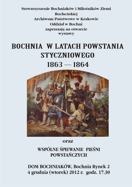 i innych miejscowości przedzierało się przez kordon i czynnie uczestniczyło, ginęło i odnosiło rany w walkach powstańczych. Także na Ziemi Bocheńskiej organizowana była pomoc i ratunek dla przekazanych Austriakom przez władze carskie uwięzionym powstańcom. Ten wkład Ziemi Bocheńskiej pokazany jest obszernie na wystawie. W czasie wspólnego śpiewania pieśni powstańczych wystąpią grupy śpiewacze Stowarzyszenia Bochniaków, Towarzystwa Miłośników Wiśnicza i Gimnazjum nr 1 im. św. Kingi w Bochni.